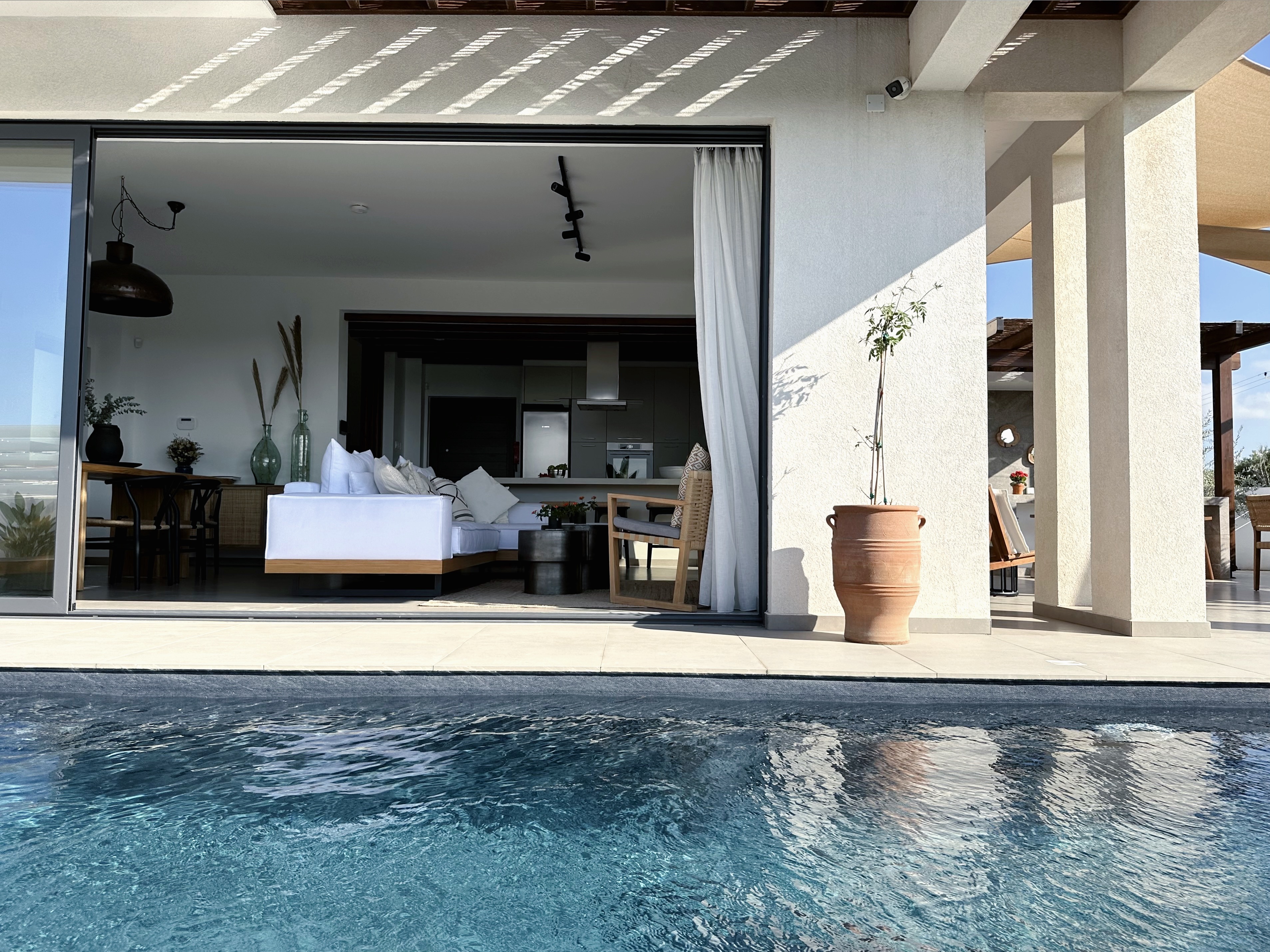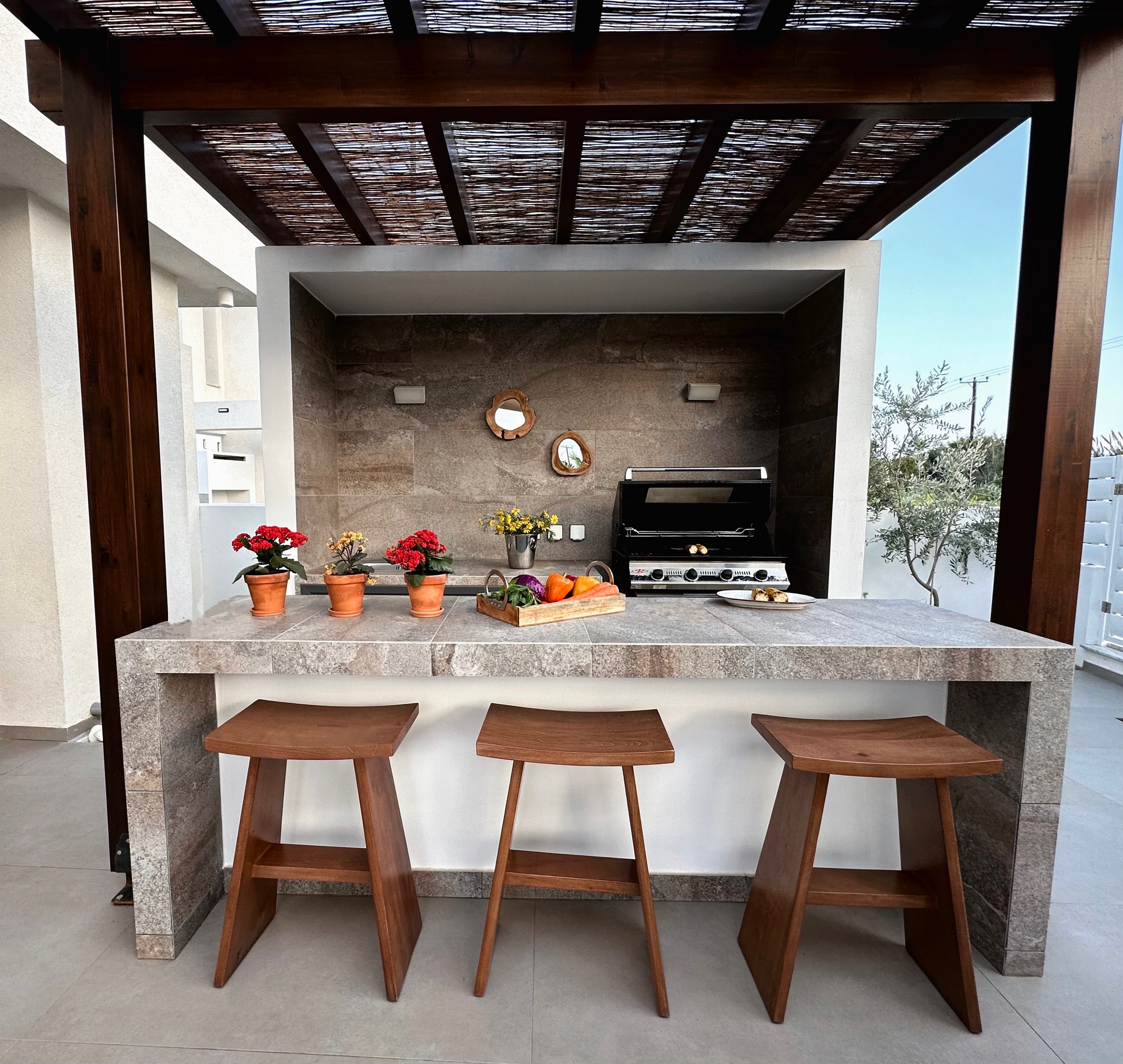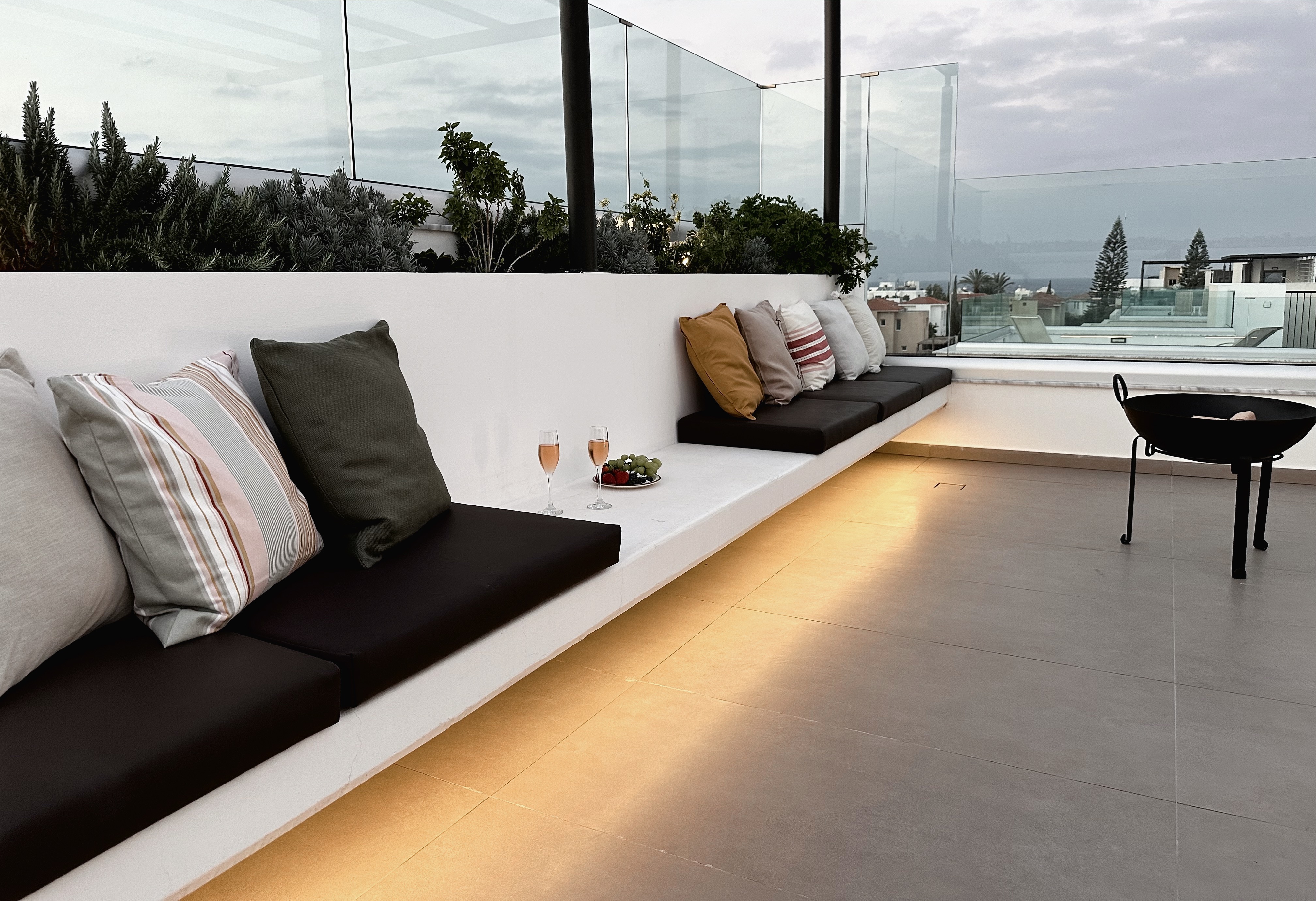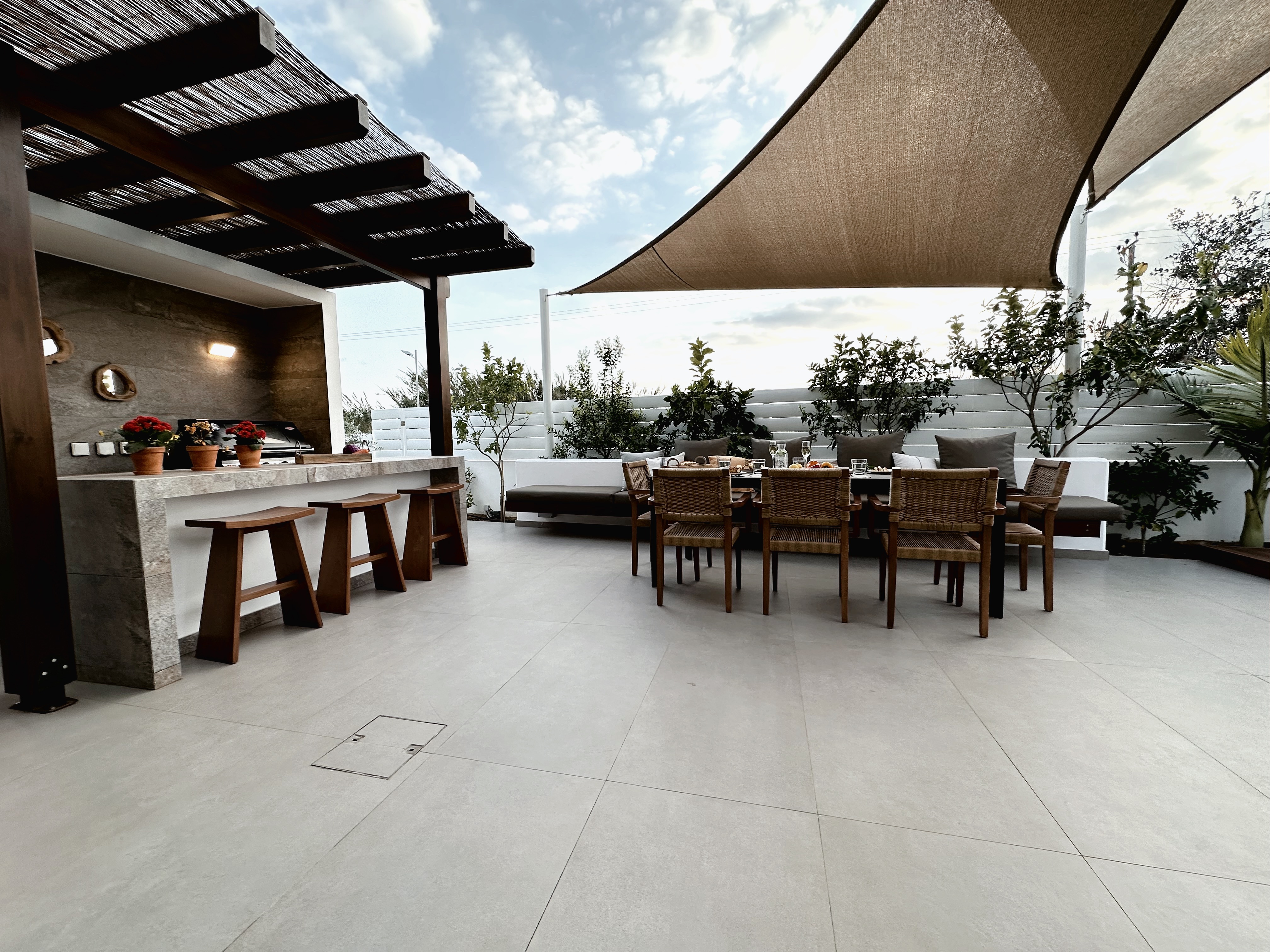 The villa includes 3 spacious bedrooms all with en-suite bathroom with walk-in shower, a kitchen area, a dining room, a living room, a guest toilet, a garage, a beautiful roof garden with a fire pit and a cocktail bar. It also provides a ground floor barbecue area with dining al fresco patio, sunbeds and umbrellas.