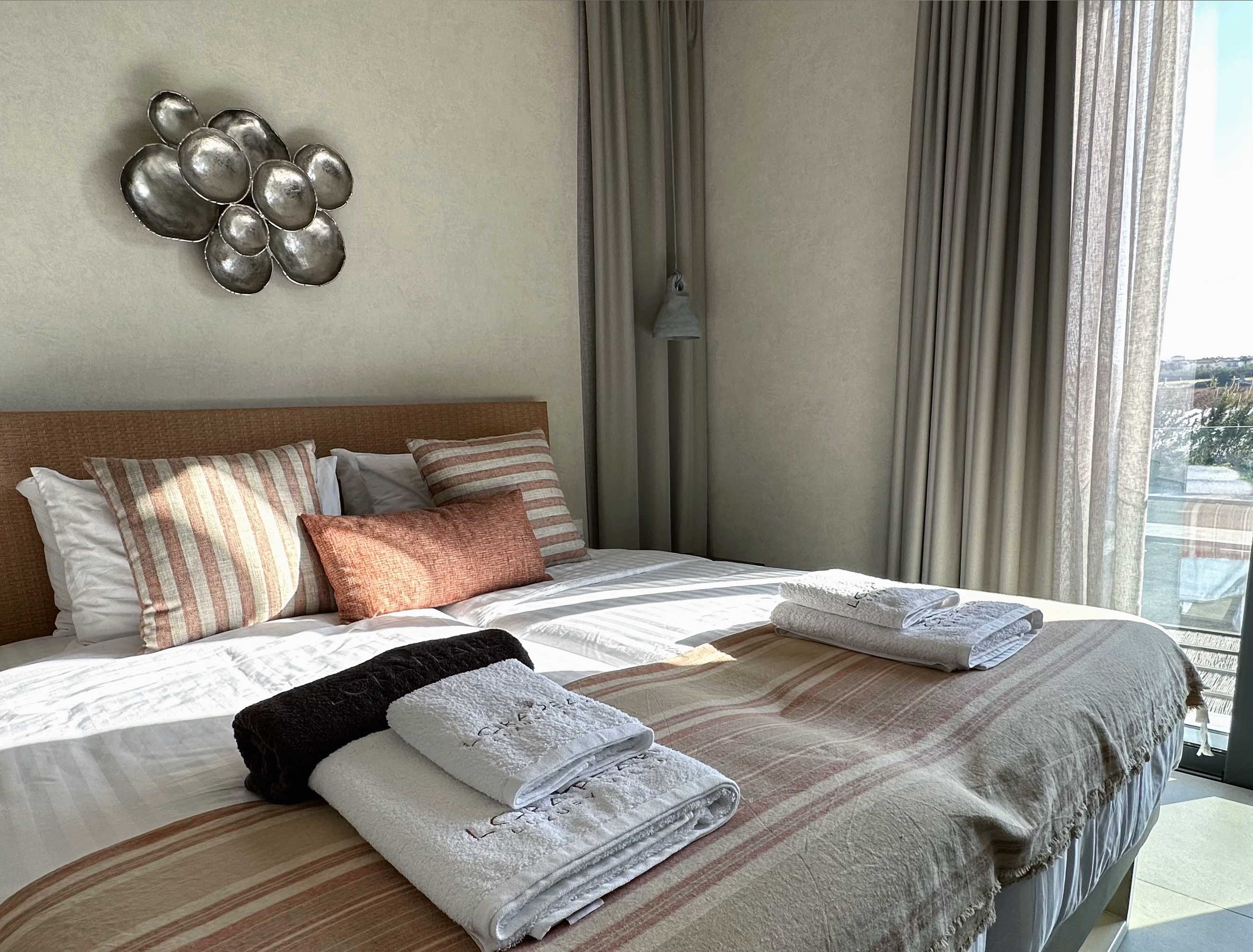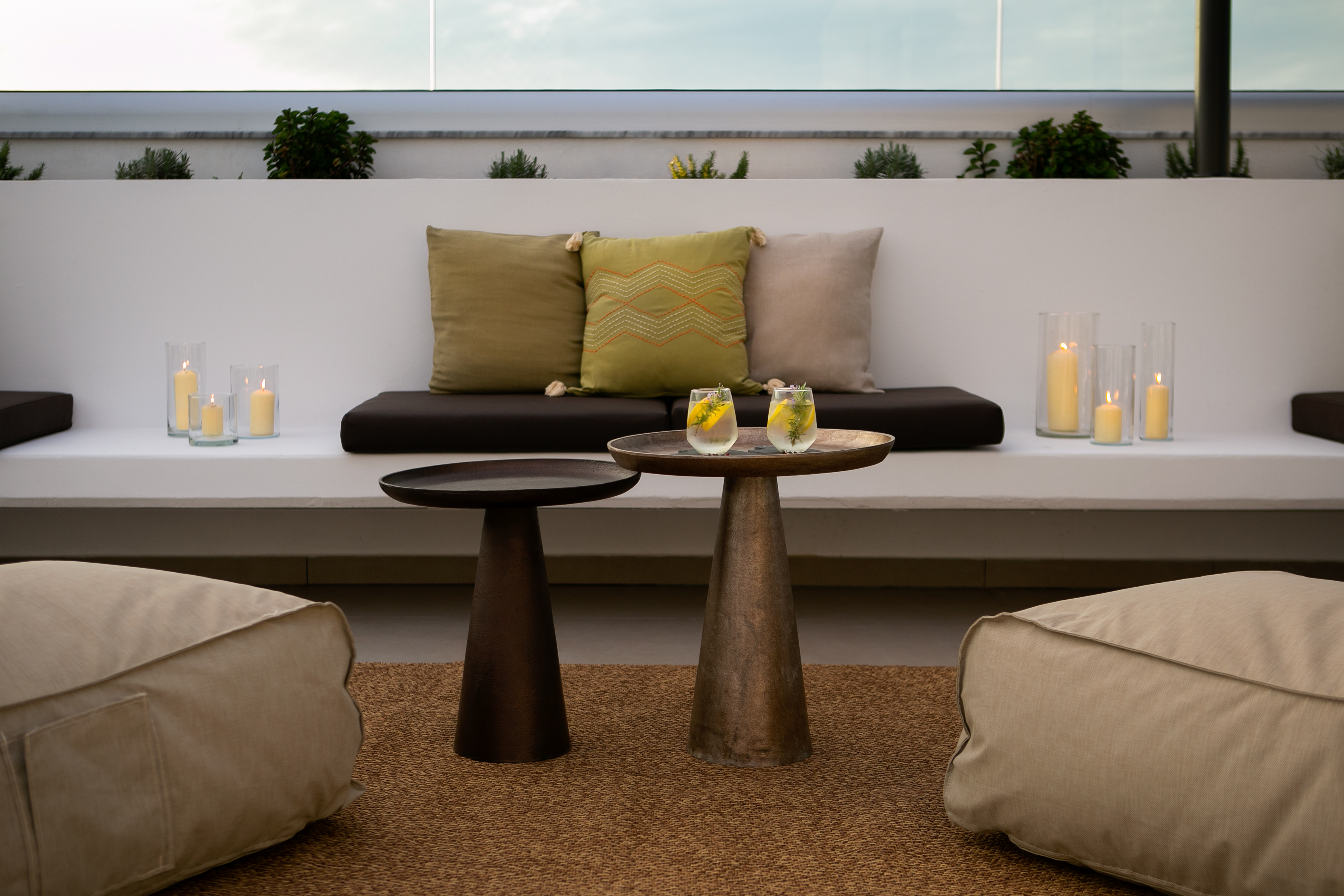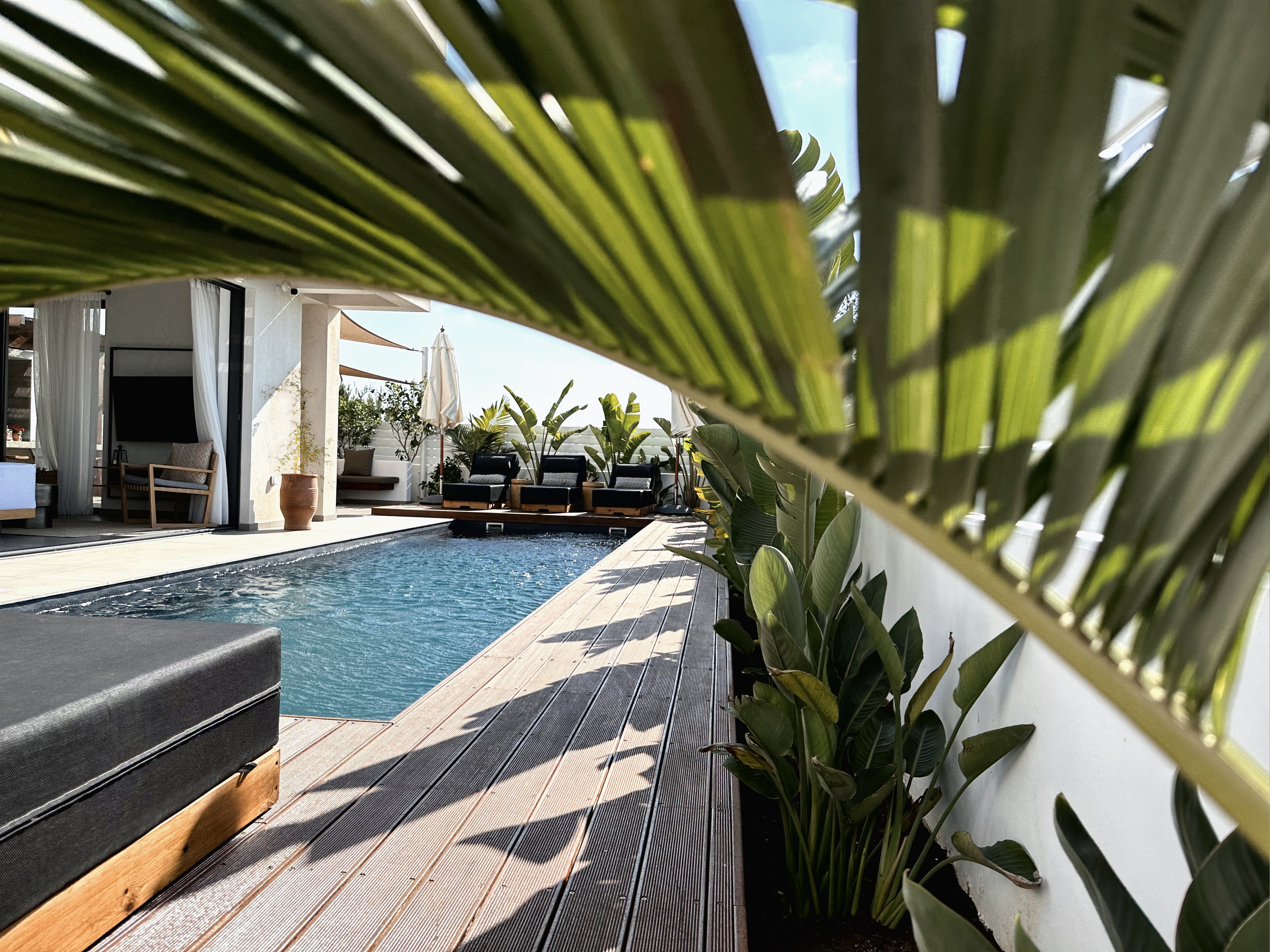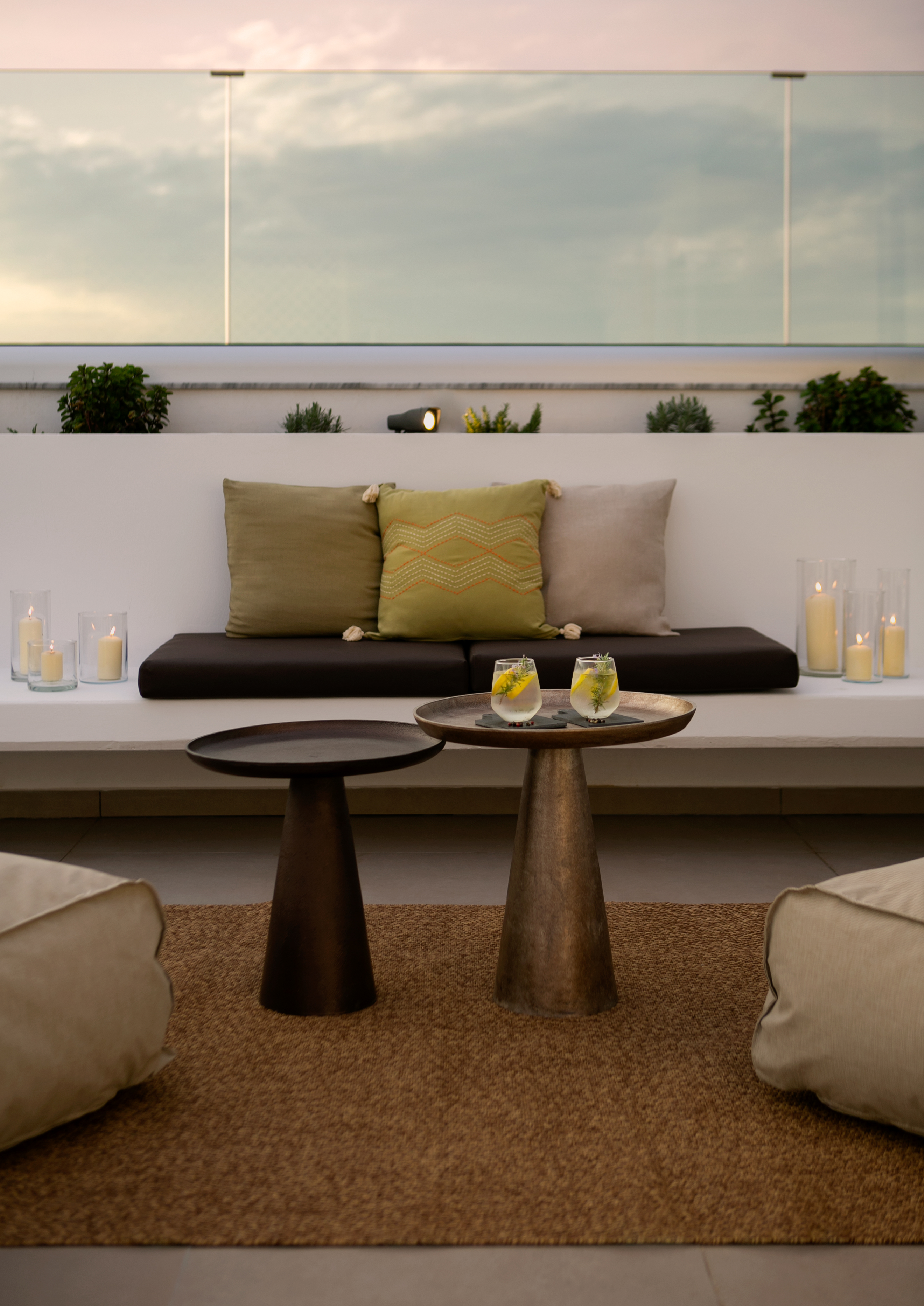 The villa includes 3 spacious bedrooms all with en-suite bathroom with walk-in shower, a kitchen area, a dining room, a living room, a guest toilet, a garage, a beautiful roof garden with a fire pit and a cocktail bar. It also provides a ground floor barbecue area with dining al fresco patio, sunbeds and umbrellas.