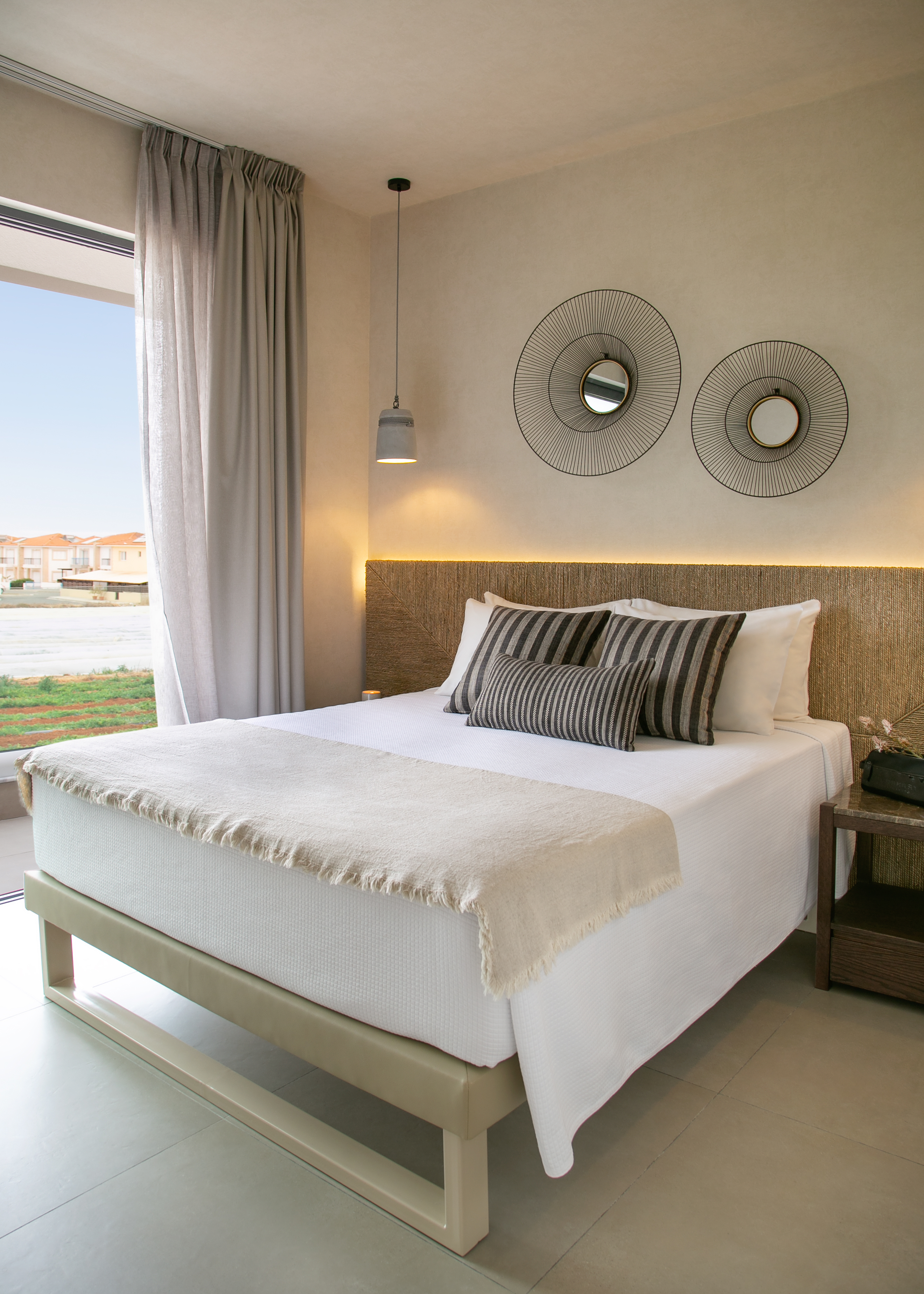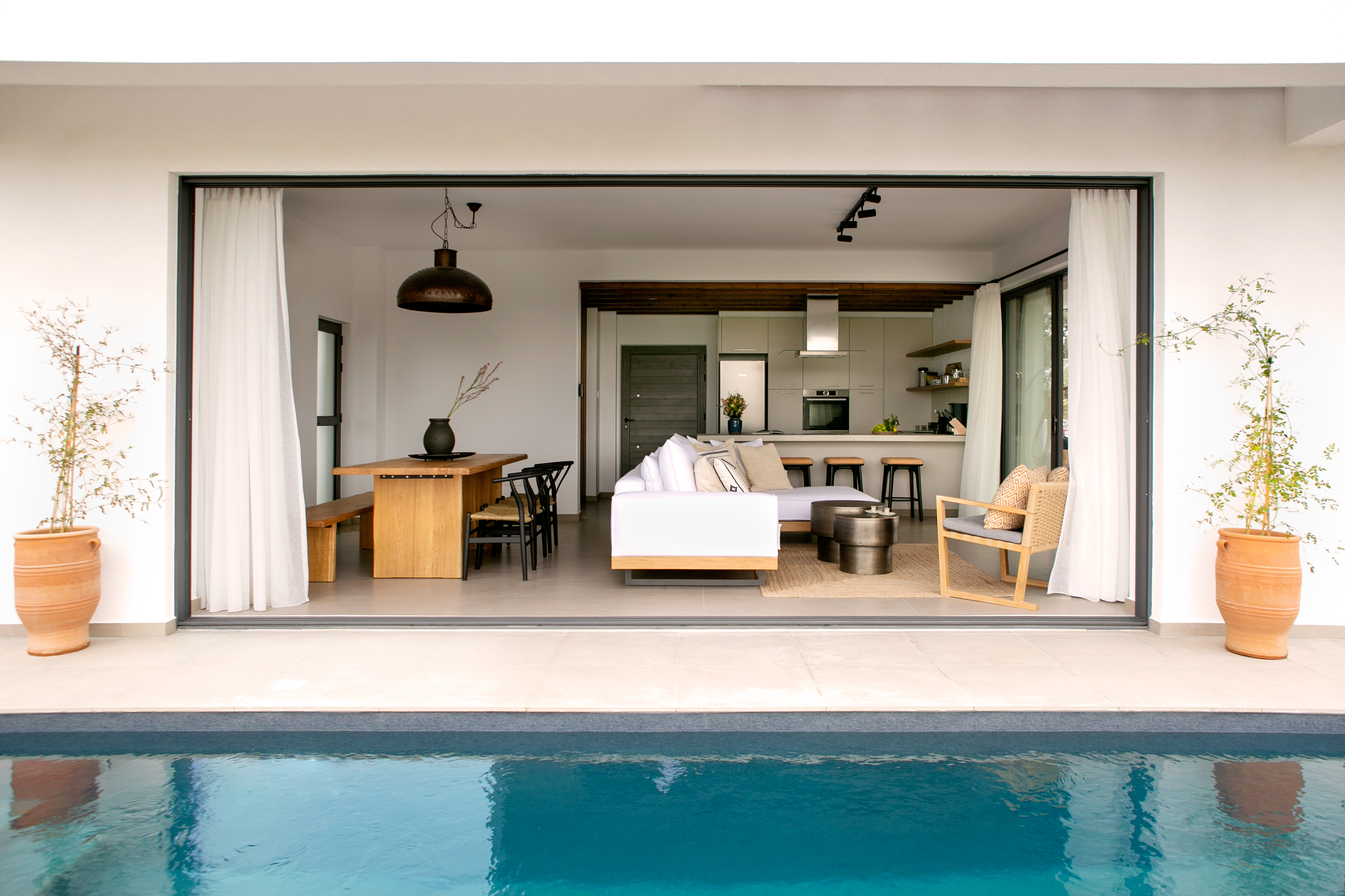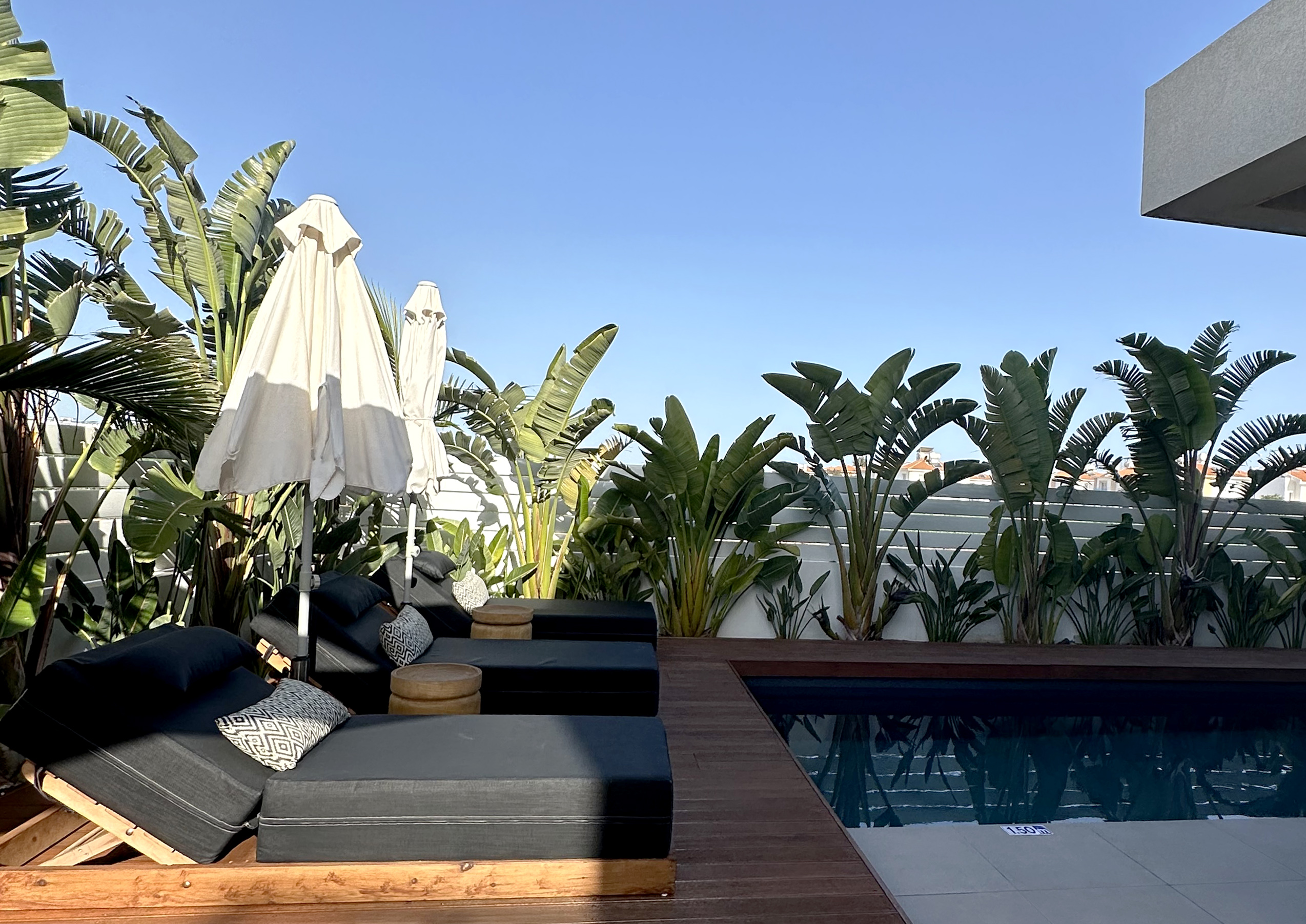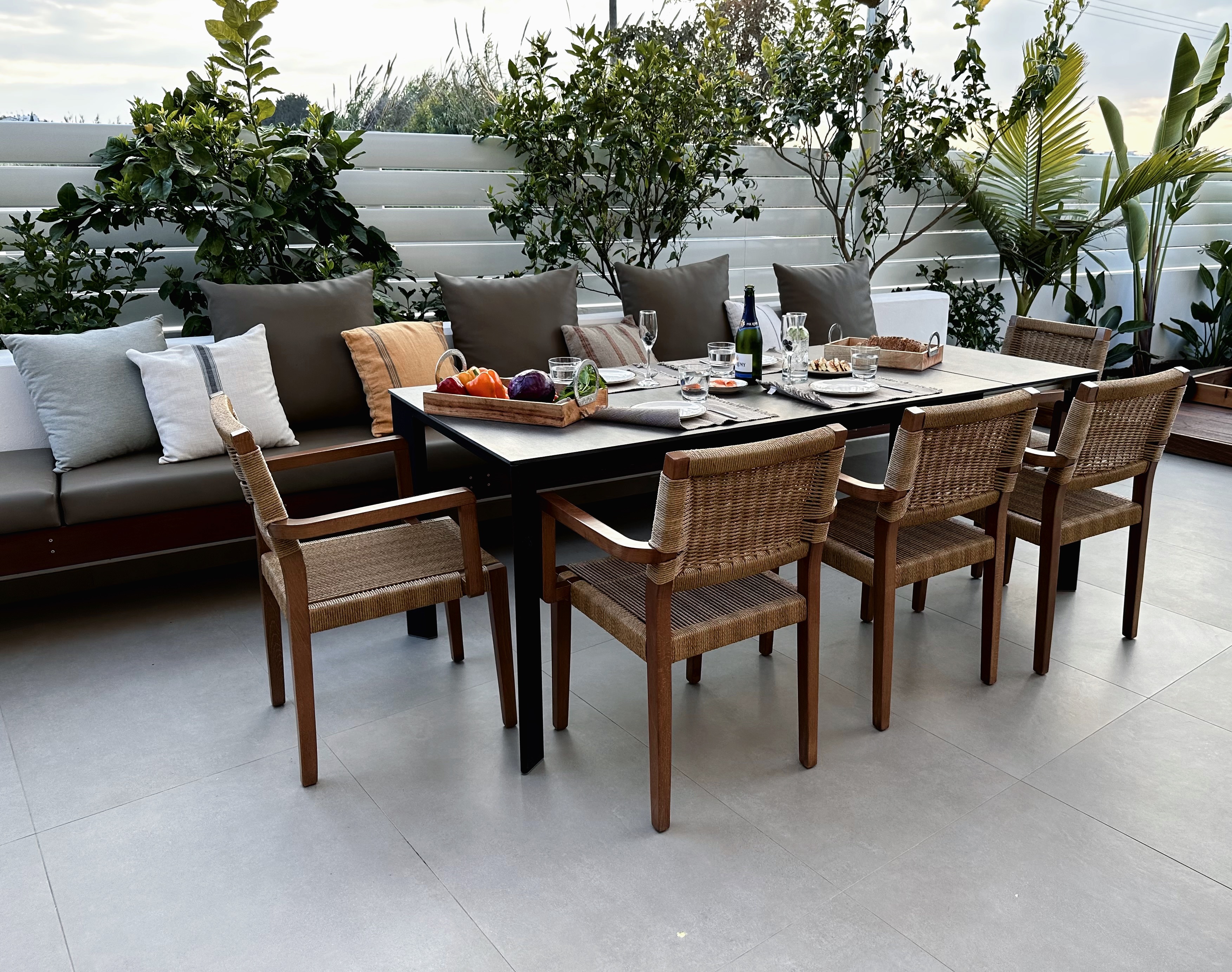 The villa includes 3 spacious bedrooms all with en-suite bathroom with walk-in shower, a kitchen area, a dining room, a living room, a guest toilet, a garage, a beautiful roof garden with a fire pit and a cocktail bar. It also provides a ground floor barbecue area with dining al fresco patio, sunbeds and umbrellas.