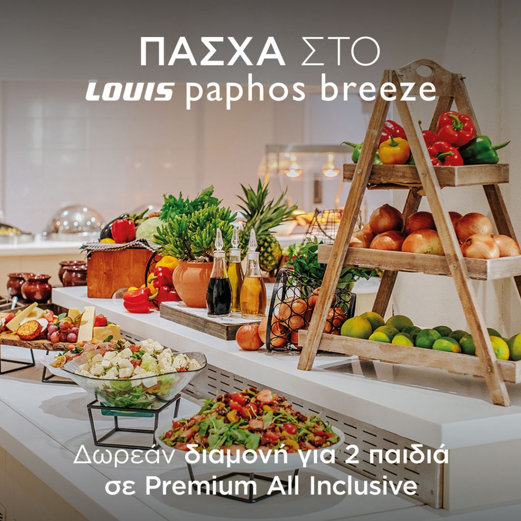 Γιορτάζουμε Πάσχα στο Louis Paphos Breeze με αναβαθμισμένο μεσημεριανό buffet με κοκορέτσι, χοιρινή και αρνίσια σούβλα καθώς και παραδοσιακά αυγά, και αφήνουμε για φινάλε λαχταριστά τσουρέκια. Κάντε κρατήσεις μέχρι τις 26/04/2024 και απολαύστε σε Premium All-Inclusive διανυκτέρευση για 2 παιδειά δωρεάν και extra έκπτωση με το Loyalty πρόγαμμα του MyLHClub!